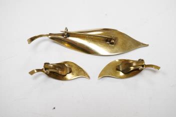 A Norwegian gilt white metal and red enamel demi parure, by David Andersen, comprising a leaf shaped brooch, 65mm and a pair of matching ear clips.