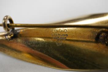 Lot 908 , A Norwegian gilt white metal and red enamel demi parure, by David Andersen, comprising a leaf shaped brooch, 65mm and a pair of matching ear clips.