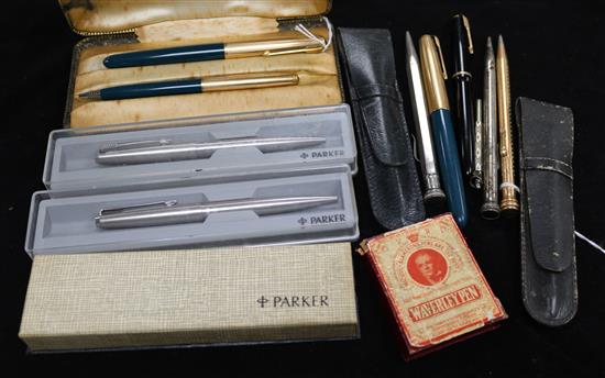 A Parker 51 teal and gold-coloured pen and pencil set, boxed, seven other Parker pens, two 'Eversharp' propelling pencils and sundries