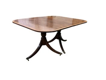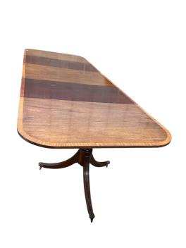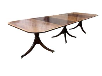 Lot 34 , A Regency style mahogany and satinwood banded three pillar dining table, width 320cm extended, two spare leaves, depth 114cm, height 74cm