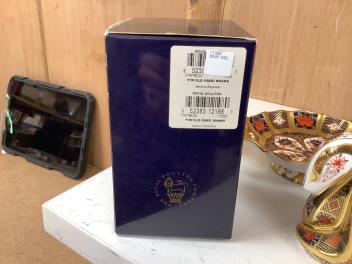 Dish good. Blue bird with silver stopper, others gold. All in good condition. Boxes fair to good. Larger blue box has label Old Imari Snake, image 7. Other (lighter) box labelled Christmas Wreath Robin, image 8.