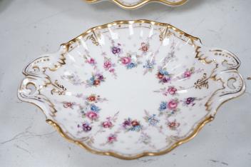Teapot, milk jug, sugar bowl, two-handled spoon tray, strainer spoon, five cups, four saucers, six side plates - two factory seconds; soup dish, dessert dish is a facory second; serving plate. All appear unused. Not crazed.