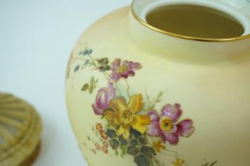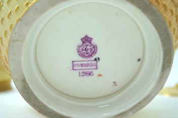 A Royal Worcester blush ivory pot pourri, cover and liner, c.1896, decorated with flowers to each side above a basket weave moulded band, puce printed mark, shape number 1286 and date code for 1896, 26.5cm high