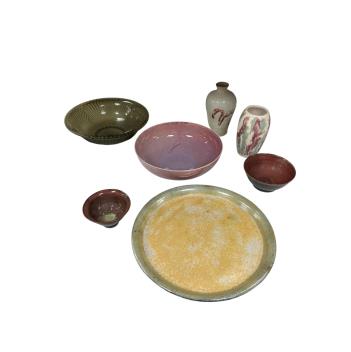 A Ruskin lustre pottery dish, studio pottery vases and a glazed lustre footed dish, largest 36cm in diameter