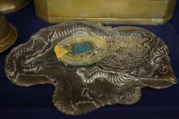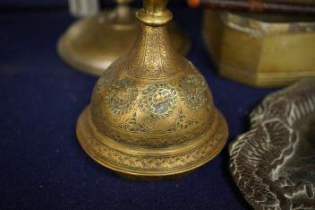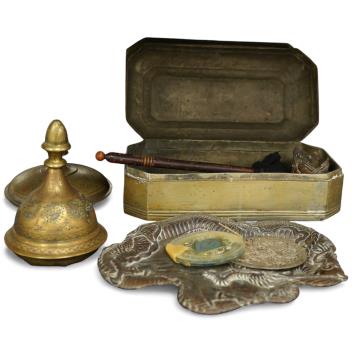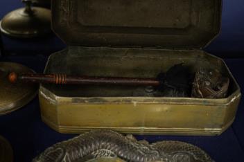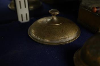 Lot 421 , A South-East Asian engraved brass betel nut box, a Japanese bronzed antimony tray and other items, box 20cm