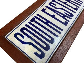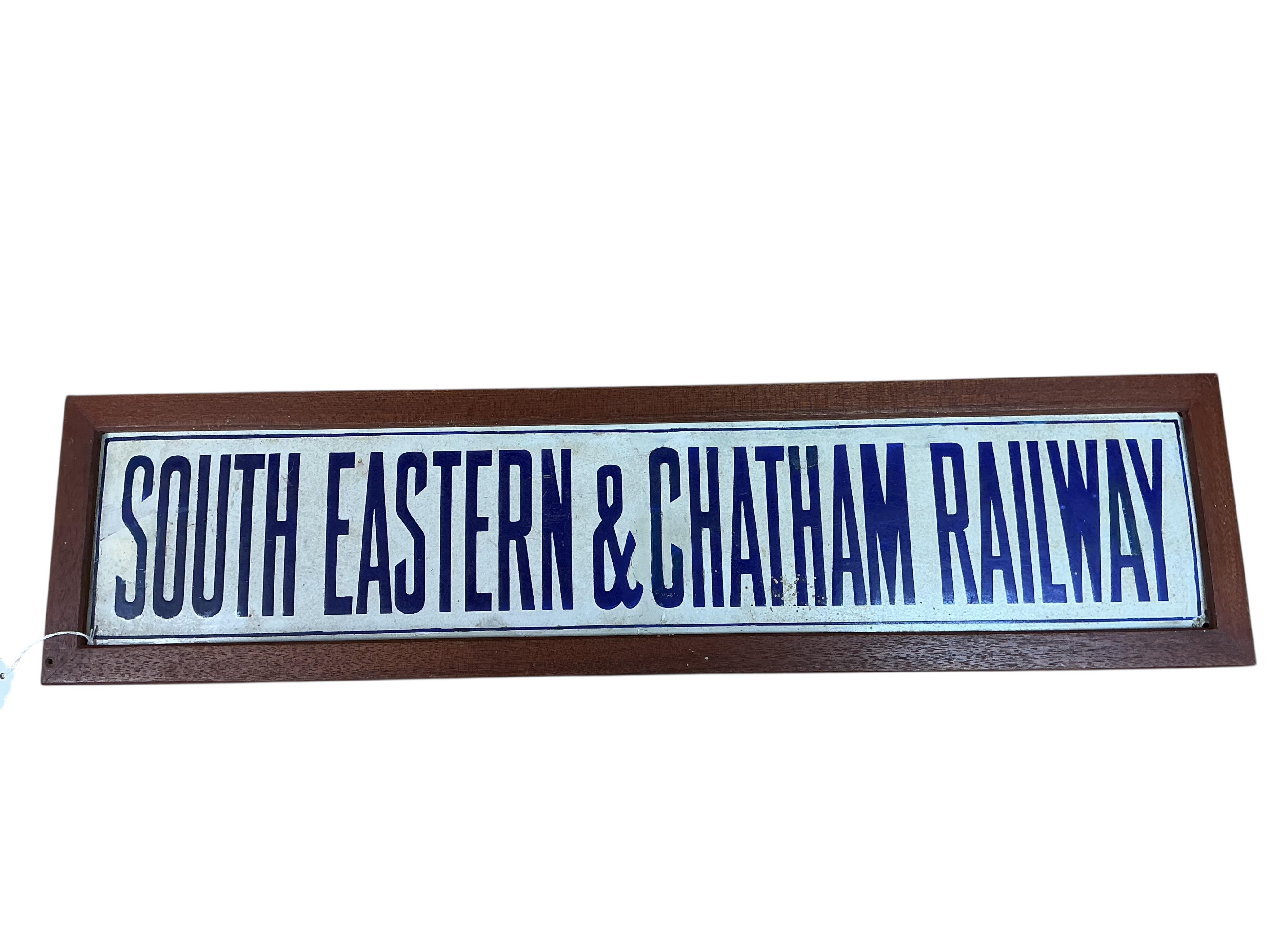 A South Eastern & Chatham Railway enamel sign, blue lettering on a white ground, 68cm wide, 15cm high, together with a later teak frame for display