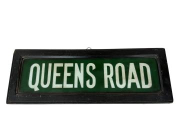 A Southern Railway glass lamp tablet for QUEENS ROAD, ex-LB&SCR, in its original wood frame, 45.5cm wide