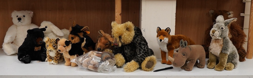A Steiff blond Teddy bear with growler, four other Steiff animals, and twelve other soft toys, the first 38cm