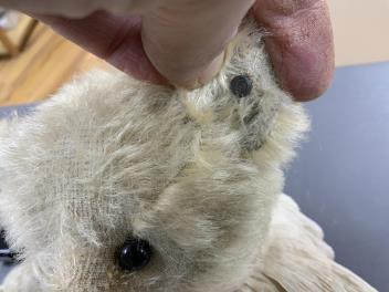 The mohair is thin overall with some areas of complete loss. The ear contains a Steiff button. The pads have been replaced with some of the original material retained.