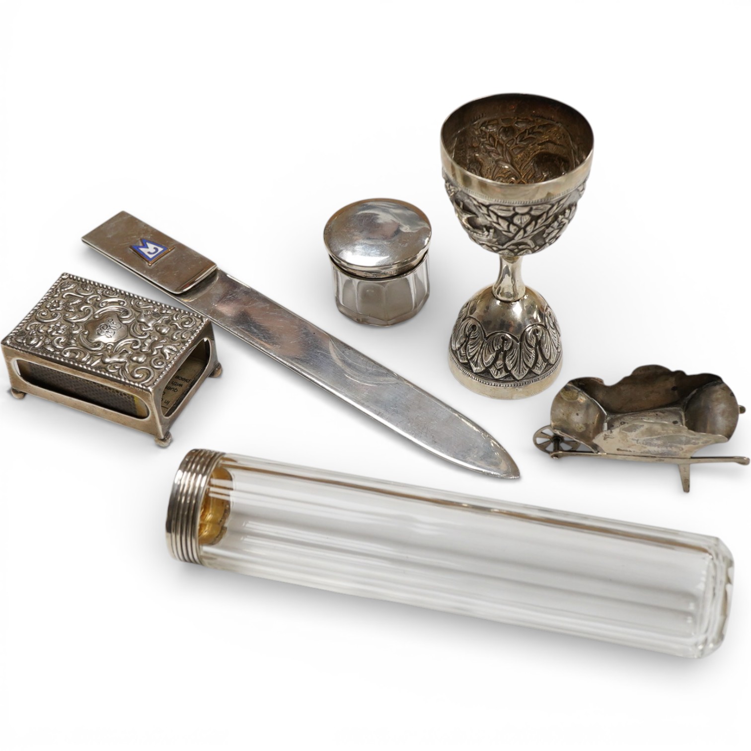 Lot 850 , A Swedish white metal letter opener, date letter for 1956, together with five other items including an Indian white metal double measure.
