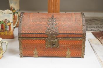 A Tibetan brass mounted painted wood dome casket, 36cm wide