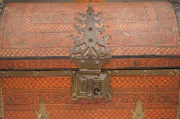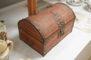 Lot 1329 , A Tibetan brass mounted painted wood dome casket, 36cm wide