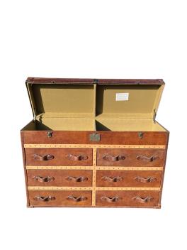 A Timothy Oulton Ampleforth sideboard in 'vintage cigar' finish, the upper compartment with hinged cover above an arrangement of six drawers, width 155.5cm, depth 52cm, height 101.5cm