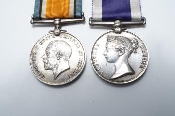 A Victoria and GV medal pair awarded to George S. Woolley, Boatman, H.M. Coast Guard, comprising of a Victoria Royal Naval Long Service and Good Conduct medal and a GV First World War 1914-1918 medal