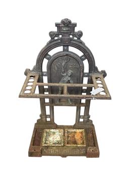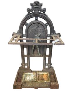 Lot 1081 , A Victorian 'Coalbrookdale' style iron sticktand 'The Smash' cast with a tennis player, width 55cm, 26cm, height 87cm