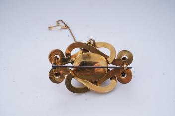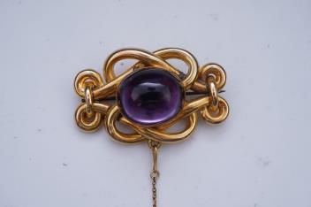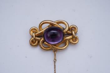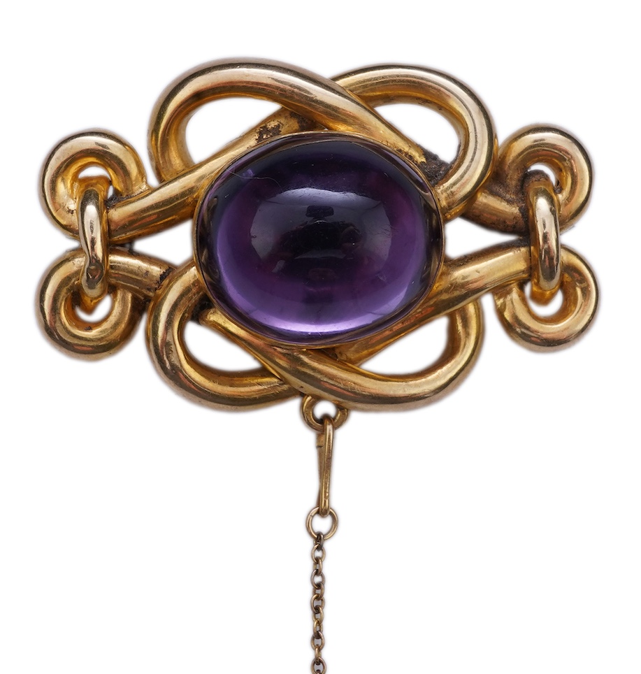 A Victorian amethyst brooch, late 19th century, claw-set with a cabochon amethyst, within a gold surround of knotted design, length 4.7cm, gross weight approximately 12.5 grams
