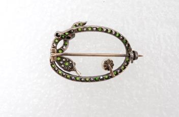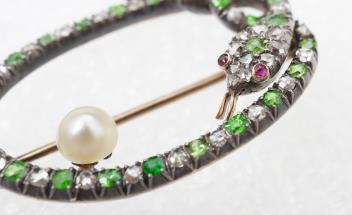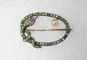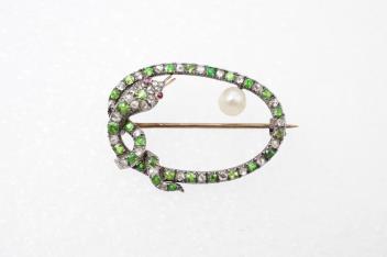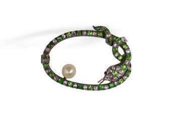 A Victorian demantoid garnet, pearl and diamond brooch, late 19th century, designed as a coiled snake, set with circular-cut demantoid garnets and rose-cut diamonds, its eyes set with circular-cut rubies, encircling a pearl measuring approximately 5mm diameter, mounted in silver and gold, length 3.4cm, pearl untested