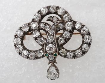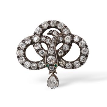 A Victorian diamond brooch, late 19th century, designed as a coiled snake with cabochon emerald eyes, its body set with circular-cut diamonds totalling approximately 2.00 carats, suspending a pear-shaped diamond weighing approximately 0.30 carats from its mouth, mounted in silver and gold, length 3cm