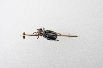 One leg and one antenna broken, one rose-cut diamond deficient, typical tarnish to silver. Base metal pin.