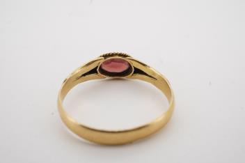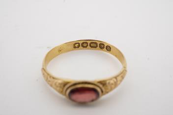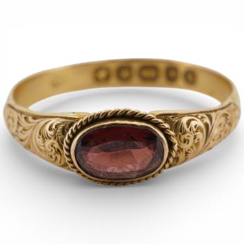 Lot 1164 , A Victorian garnet ring, circa 1863, set with an oval garnet within a rope twist border, to an 18ct gold band decorated with gold engraving to the shoulders, size P, British hallmarks, gross weight approximately 2 grams