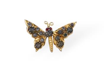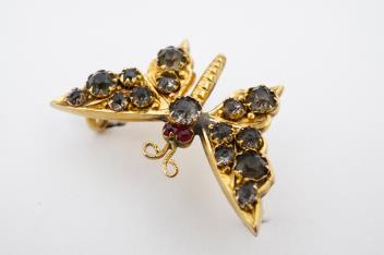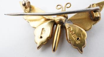 One wing repaired, some minor solder visible, wings and antennae slightly lopsided, but doesn't spoil the charming design. Brooch pin in base metal.