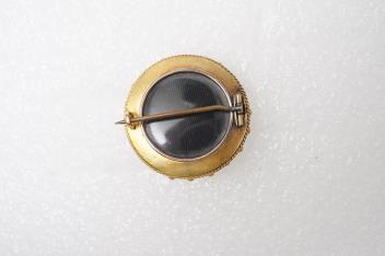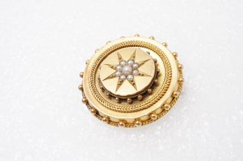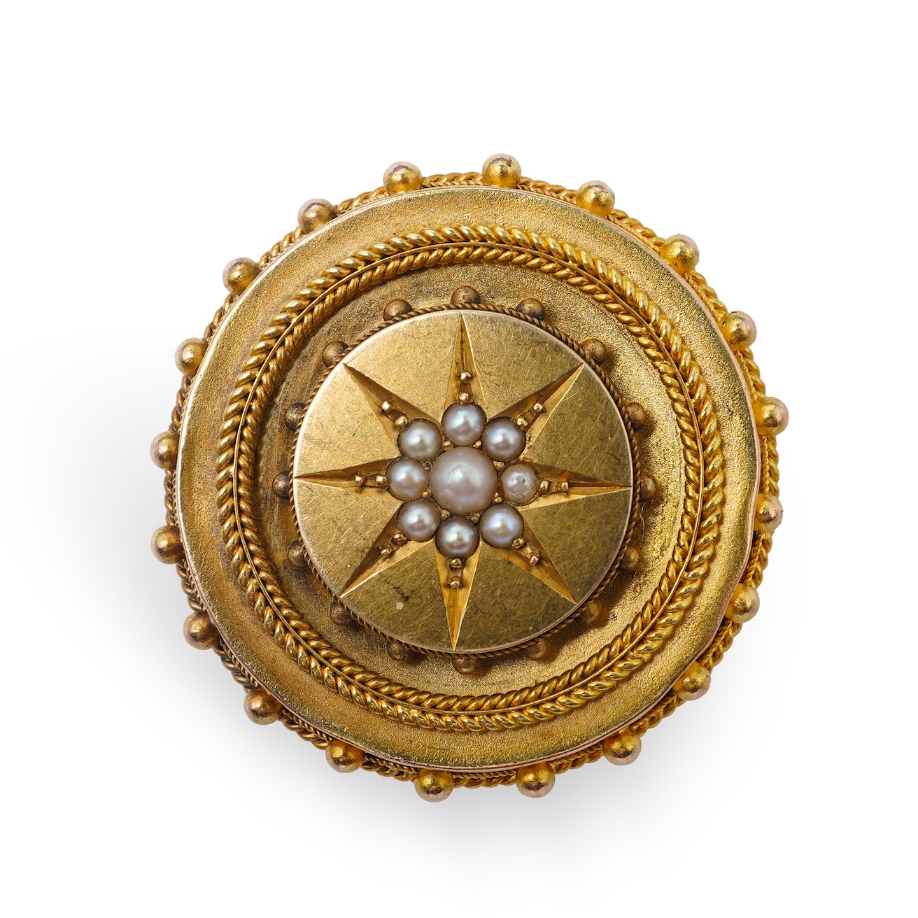 A Victorian gold and seed pearl brooch, late 19th century, designed as a roundel in the archaeological revival style, centring on a cluster of split pearls within a star setting, the outer edges with rope twist and grainti decoration, mounted in gold, the reverse with a glazed compartment, 3.8cm diameter, pearls untested