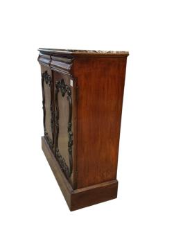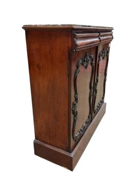 A Victorian mahogany marble topped side cabinet, width 95cm, depth 34cm, height 99cm