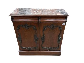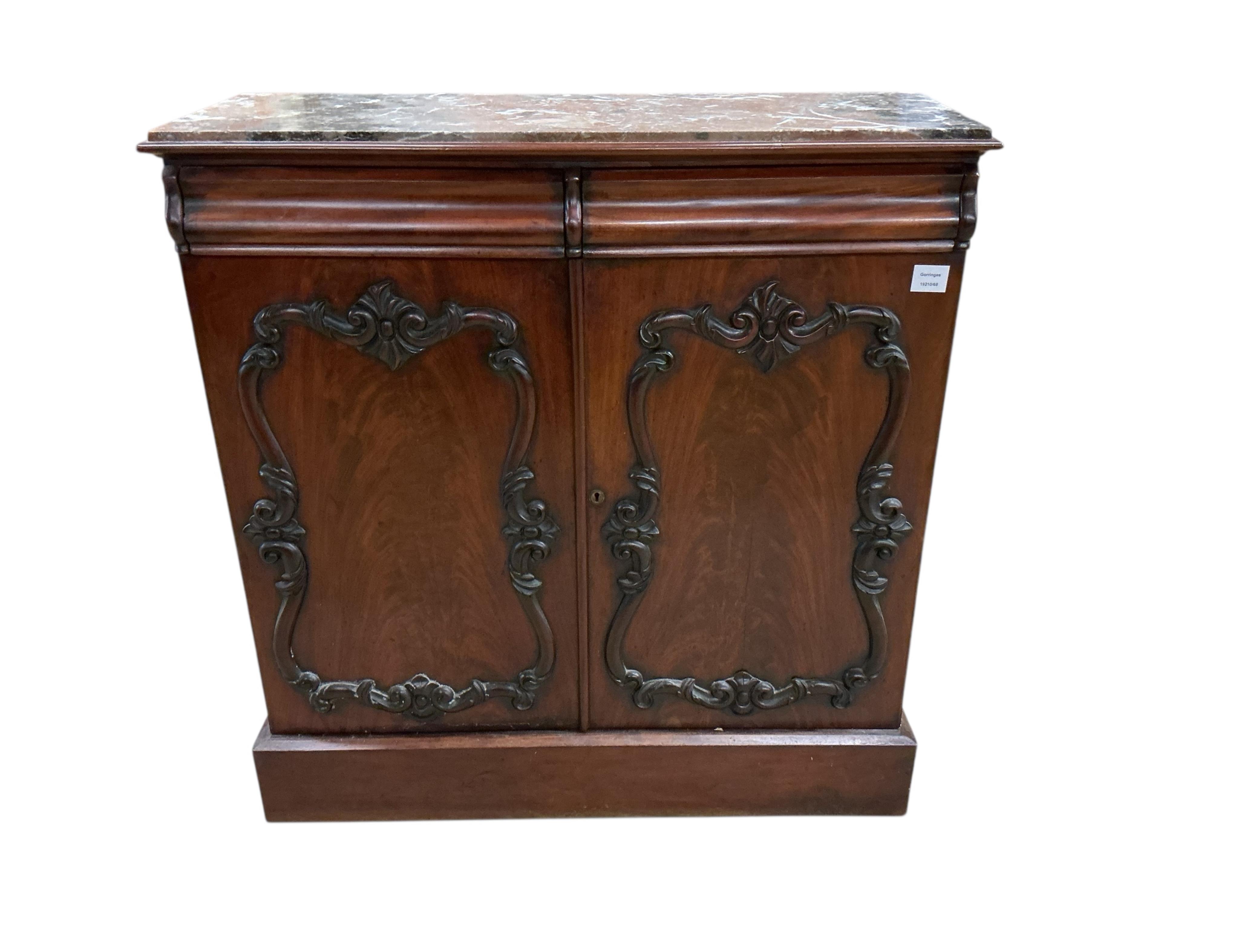Lot 1214 , A Victorian mahogany marble topped side cabinet, width 95cm, depth 34cm, height 99cm