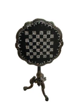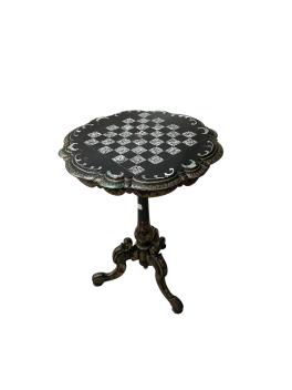 Lot 78 , A Victorian mother of pearl inlaid papier mache circular tilt top tripod games table, diameter 56cm, height 74cm