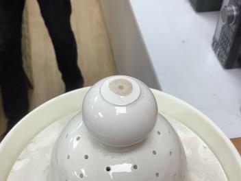 Two small dark star-cracks visible at interior but not visible at exterior, image 6; script barely legible, as catalogued; cover lacking finial; unsigned.