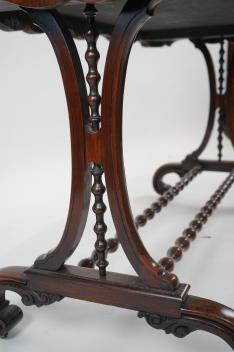 A Victorian rectangular rosewood library table on shaped end standards with twin bobbin stretcher on scroll feet, 130cm wide, 67cm deep, 72cm high