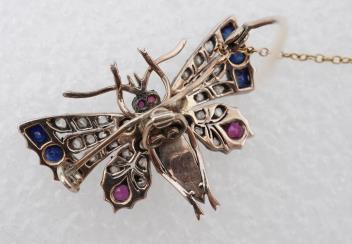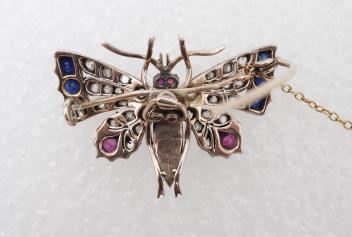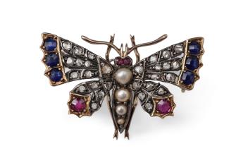 A Victorian ruby, sapphire, pearl and diamond brooch, late 19th century, designed as a butterfly, set with rose-cut diamonds, circular-cut rubies and sapphires and split pearls, mounted in silver and gold, wingspan 3.7cm, detachable brooch fitting, pearls untested