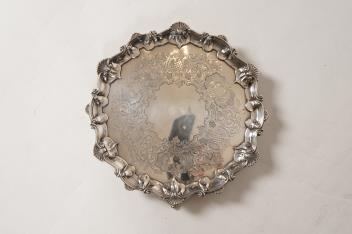 A Victorian silver salver by Edward & John Barnard, of shaped circular form, with shell and scroll border and engraved foliate scroll decoration, on three scroll feet, London, 1856, diameter 26.3cm, 17.3oz.
