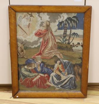 A Victorian woolwork panel, Agony in the Garden of Gethsemane, maple framed, 57cm x 45cm