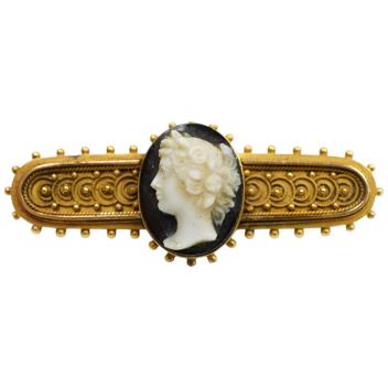 Lot 906 , A Victorian yellow metal and hardstone cameo set bar brooch, with cannetille work decoration and carved wit the bust of a lady to dexter, 50mm, gross weight 10 grams.