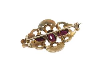 Lot 1925 , A Victorian yellow metal and three stone oval cut garnet set brooch, with scrolling border, 41mm, gross weight 4.6 grams.