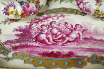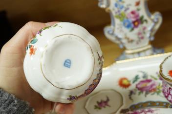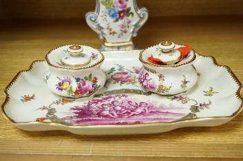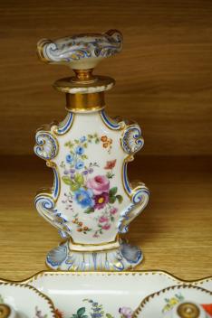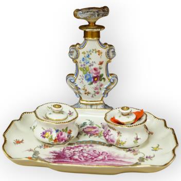Lot 408 , A Vienna style porcelain deskstand with two inkwells and floral painted scent bottle, largest 26cm wide