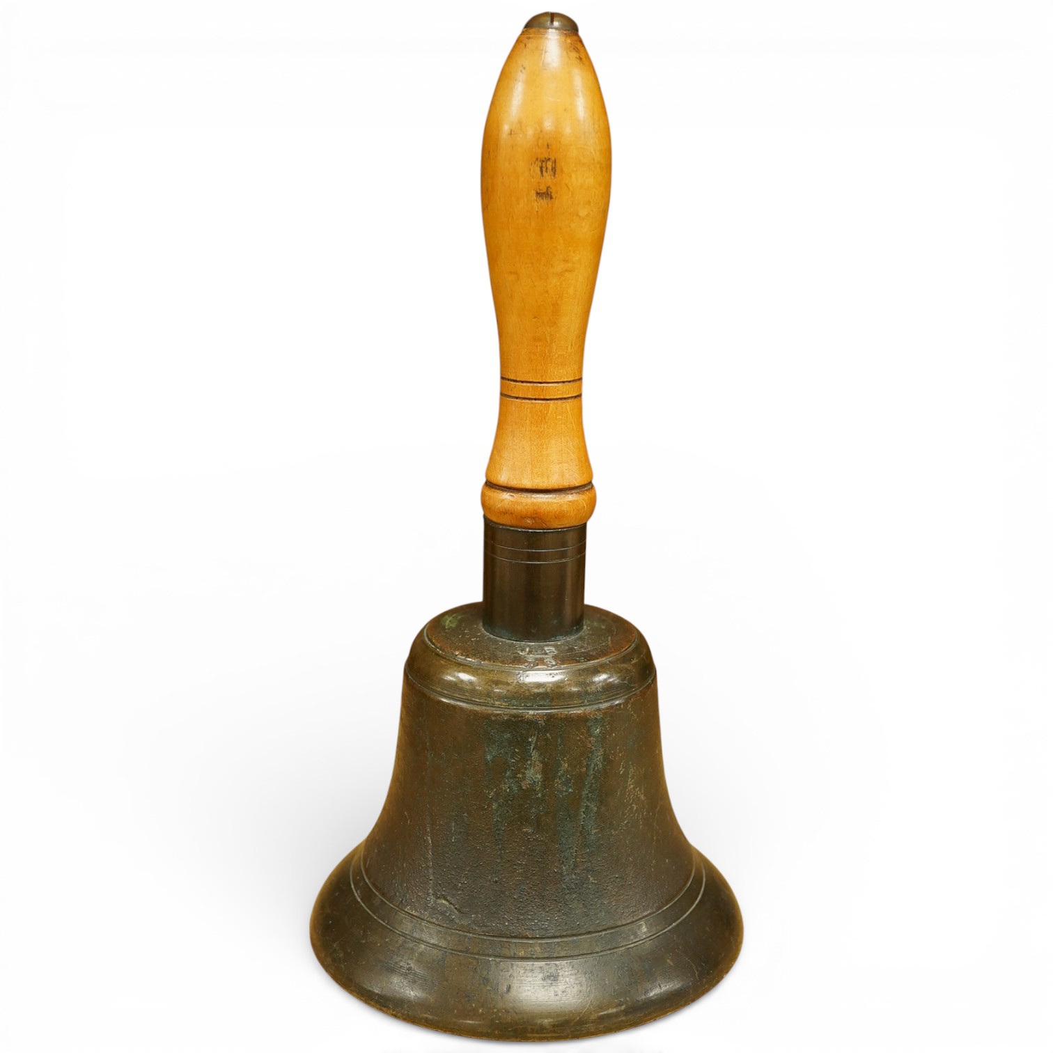 A WWII bronze ARP handbell with beech wood handle, stamped “Fiddian” to the top of the bell, with ‘J.B. 39’ beneath, and ARP cast into the rim, with ‘8’ applied in drilled decoration above, overall height 25cm, diameter of the bell 13cm