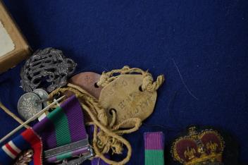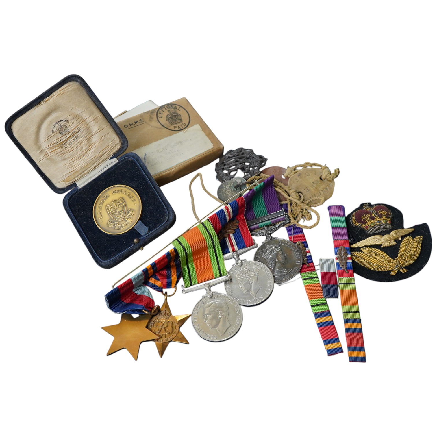 A WWII medal group awarded to Squadron Leader R.J. Sanceau, R.A.F., including; the 1939-1945 star, the Burma star, the Defence medal, the 1939-1945 medal with oak leaf (mentioned in dispatches), and a ERII General Service Medal with clasp for Malaya, with the original issue card box, two ribbon bars and paperwork, together with an RFC cap badge and cloth RAF badge, plus the dog tags for V.E.H. Sanceau and a cased Lancing College medal