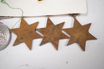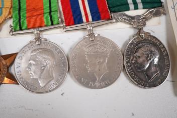 Lot 1336 , A WWII medal group of six medals, together with the official accompanying paper slip, comprising; the Air Crew Europe star with a clasp for France and Germany, the Africa star, the 1939-1945 star, etc., plus the GVI Air