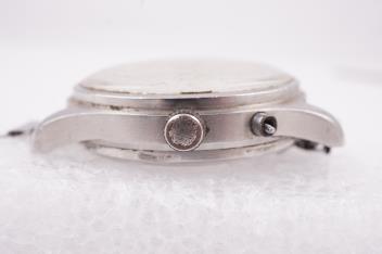 Dial a little discoloured. Dial and movement unsigned. Scratches to the dial cover. Loss and degradation to the luminescent material on the hands and dial in places. Button missing from chronograph function. Scratches to the case back and sides. Hands adjust, but the crown dose not wind. Watch not running and the button function is not operational, so in need of attention. Strap in poor condition. Some rust visible on the movement.