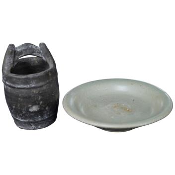 A Yuan green pottery glazed dish and bucket - 10cm high