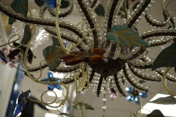 Lot 518 , A an ornate six branch chandelier with painted metal flowers and multicoloured coloured glass flowers - 72cm high