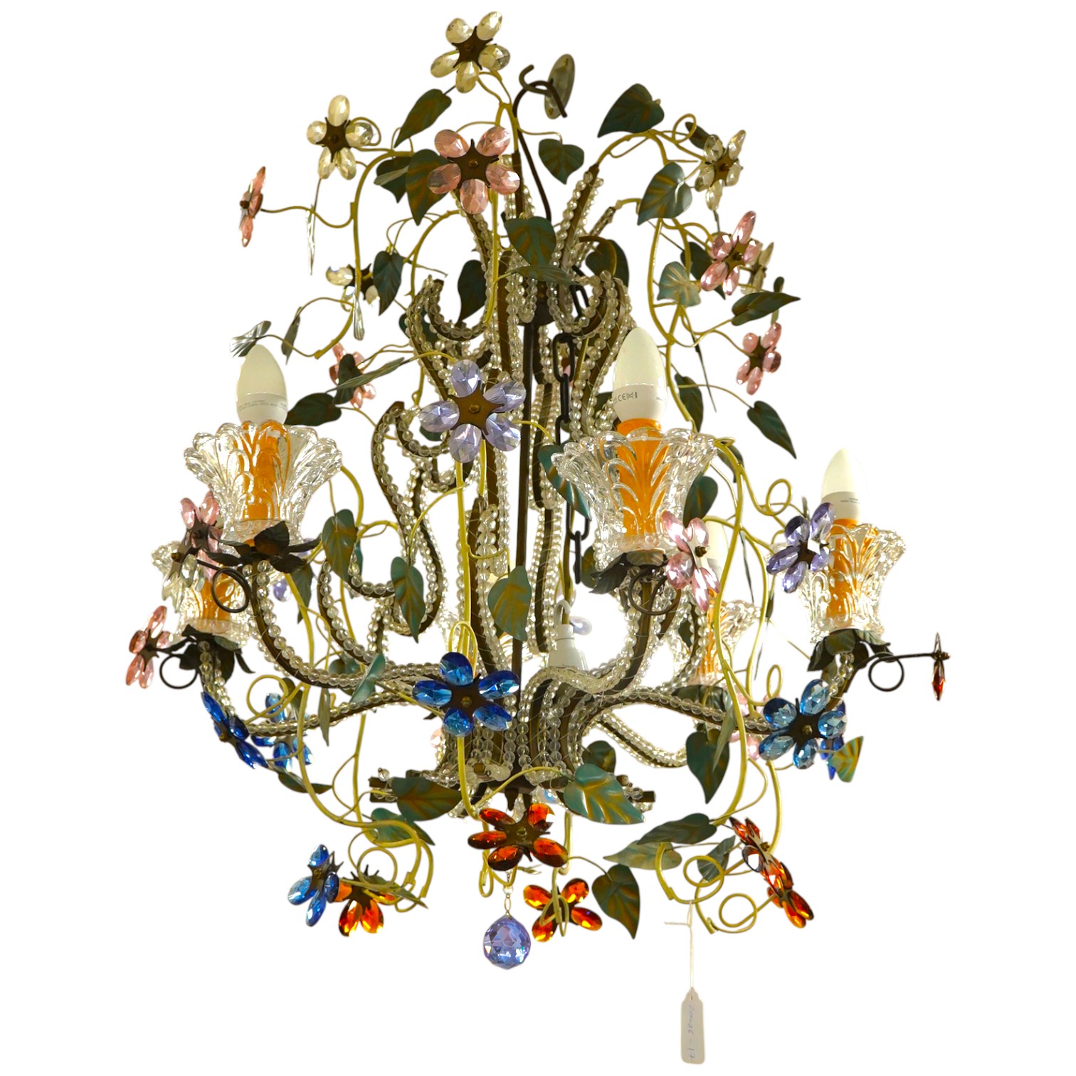 A an ornate six branch chandelier with painted metal flowers and multicoloured coloured glass flowers - 72cm high