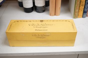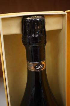 A bottle of Clos des Goisses champagne 1996, in presentation box