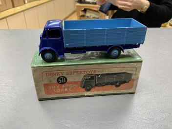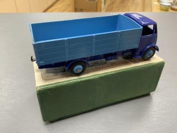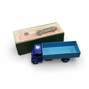 A boxed Dinky Toys Guy 4 Ton Lorry (511), dark blue cab and chassis, light blue body and wheels, together with the original green illustrated box