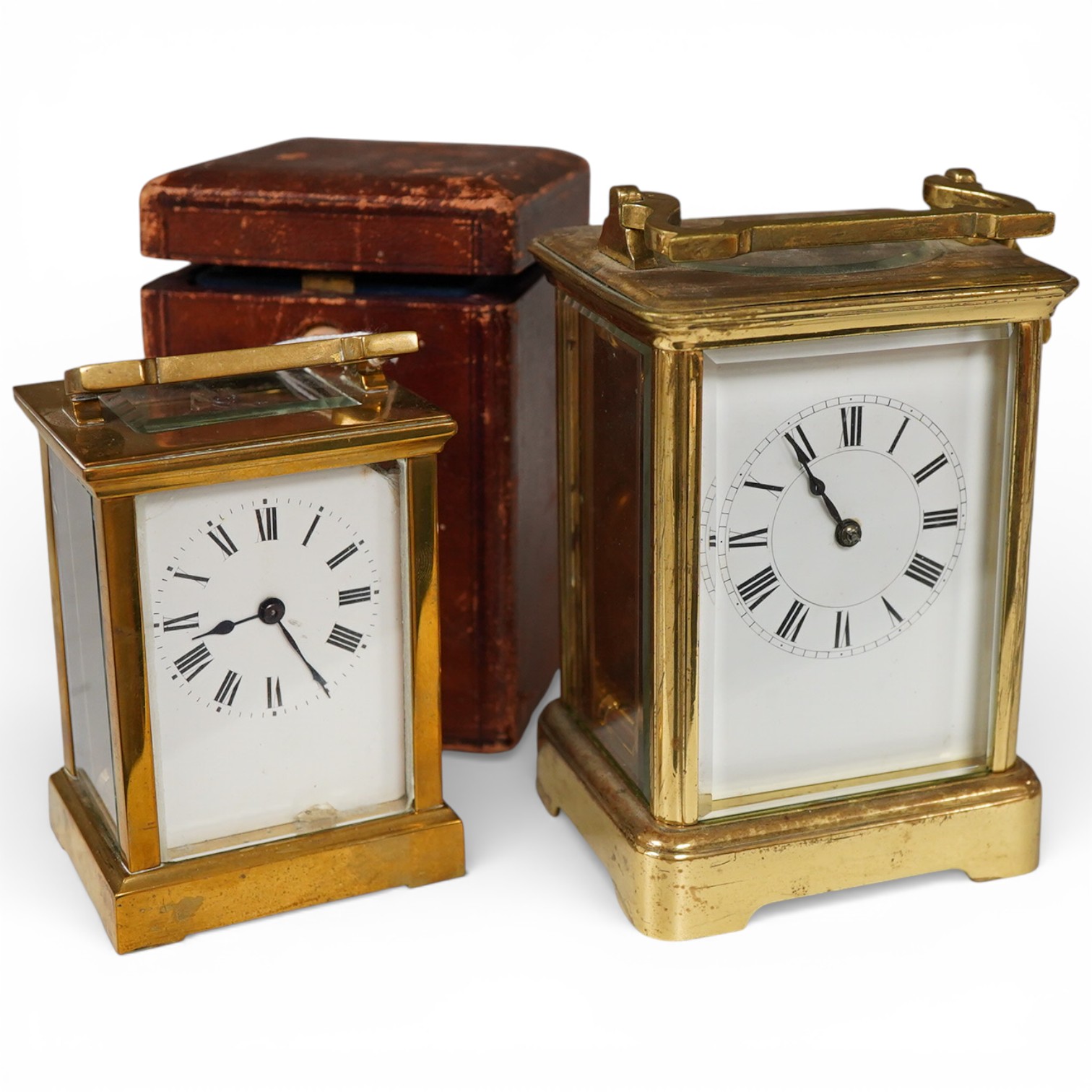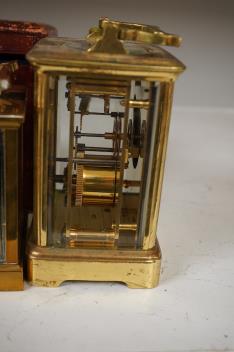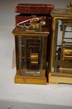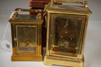 Lot 1469 , A brass carriage clock, 14cm, portable in leather case, and a larger carriage clock, tallest -14.5cm high