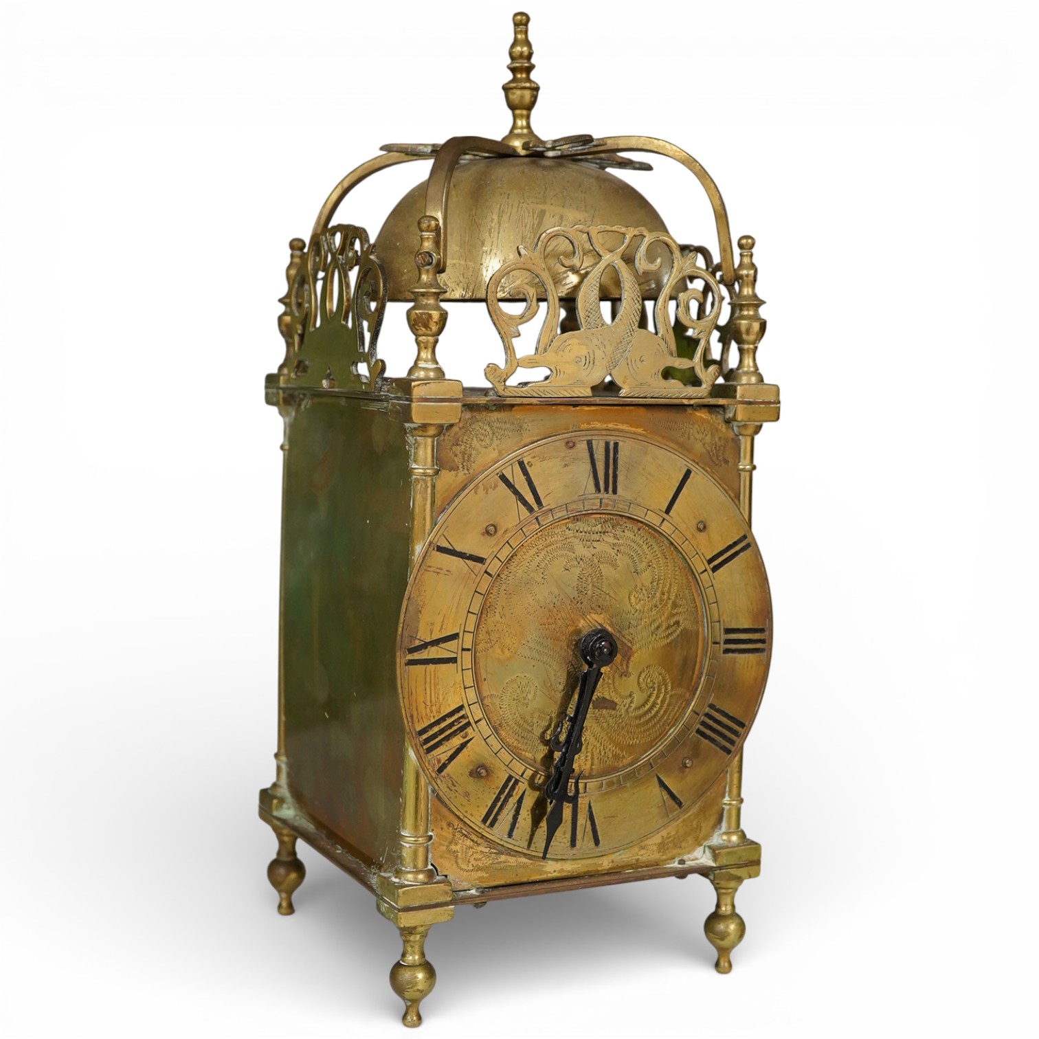 Structurally good; lacquered brass finish tarnished; bell is ornamental only. Has been set going over some 48 hours and is working, although not guaranteed.
