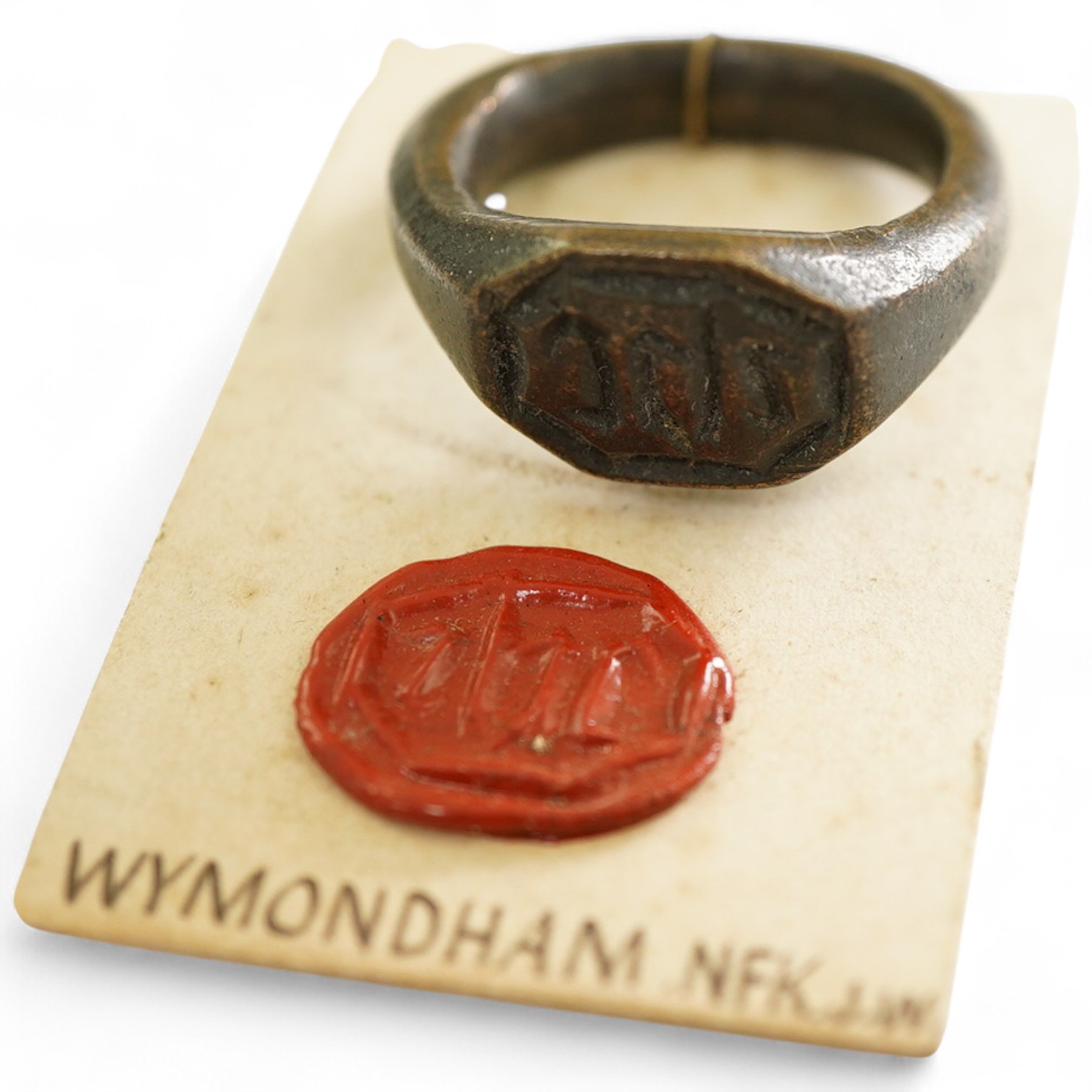 Lot 3006 , A bronze devotional signet ring, England, 16th/17th century, the octagonal panel inscribed with the Christogram IHC, to a plain bronze band, size S1/2, Provenance: formerly in the collection of Dame Joan Evans (1893-1977