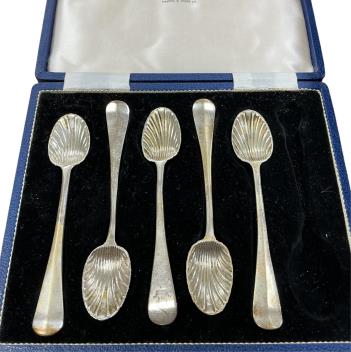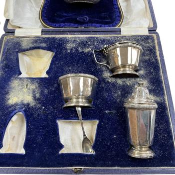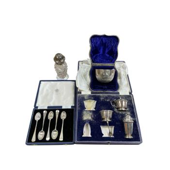 Lot 1860 , A cased Edwardian silver sugar bowl, Josiah Williams & Co, London, 1901 a cased part silver cruet set, plated spoons and a silver mounted glass sugar caster.